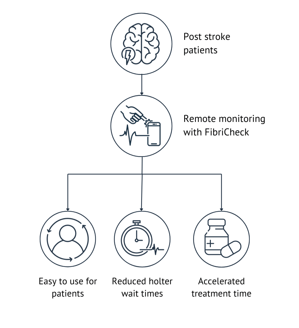 Project outline: Over at Barking, Havering and Redbridge University Hospitals, FibriCheck is implemented so that post-stroke patients could monitor themselves at home to detect atrial fibrillation. The goal of this implementation is to accelerate care and to reduce the increasing waiting time for Holter devices. Both staff and patients experience improved care outcomes as FibriCheck made the post-stroke monitoring process more efficient. Because of the success of this implementation, this new way of working has become part of the hospital’s routine practice.