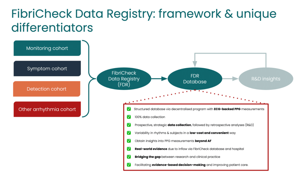 Today, the gold standard in heart rhythm monitoring is electrocardiography (ECG), but more and more evidence is available regarding the untapped potential of photoplethysmography (PPG) for cardiac monitoring. With the help of artificial intelligence (AI), we can further unlock this potential, but for that, we need real-world data from a broad range of individuals in free-living conditions. The FibriCheck Data Registry is a unique strategy to collect this data. Real-world data allows us to continuously monitor our product performance. More importantly, it supports our scientific advancements, the development, and improvement of upcoming AI models which significantly increases the capabilities and robustness of our technology.