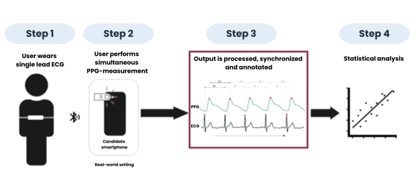 We intend to collect real-world data by asking both users with irregular measurement results and healthy volunteers to perform PPG measurements on their smartphone, in combination with simultaneous ECG measurements as a gold standard reference.