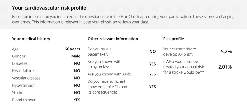 This section of your FibriCheck report gathers all the information about your cardiovascular risk profile. Based on the questionnaire you filled in on the app, we worked out your rate of risk of developing atrial fibrillation or a stroke. Do bear in mind that this is a snapshot of a given period and that your risk profile may change over time.