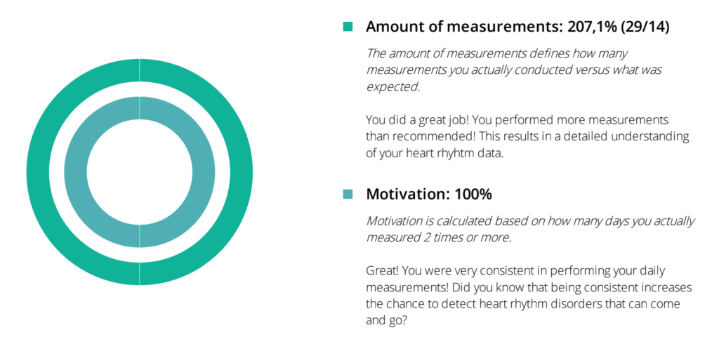 This section of your report also contains an analysis of the way you use FibriCheck. To make the most of FibriCheck, we would advise you to measure your heart rhythm twice a day and whenever you are experiencing symptoms, unless your doctor recommends otherwise. This analysis is to help you achieve this goal. If you are using FibriCheck to optimum effect, you should achieve a score of 100%.