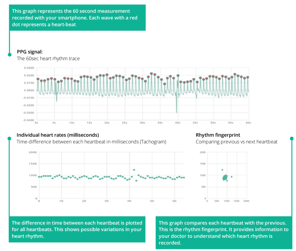 - PPG signal: FibriCheck measures your heart rhythm by way of a photoplethysmogram (PPG). This technology measures your heart rhythm by looking at the changes in the amount of blood that is being pumped through your blood vessels. We do so by using the torchlight on your smartphone and the small blood vessels in the tip of your fingers. The graph of the PPG signal visualises this change in the amount of blood.