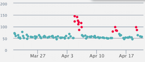 Detecting paroxysmal atrial fibrillation can be challenging, as the episodes of this heart rhythm disorder may come and go and can be very short in duration. When a user hasn’t performed a sufficient amount of measurements, then it’s harder to interpret this data and make clinical decisions. When there has only been one measurement which recorded AF as seen in the figure below, it makes it difficult to be confident in changing the patient’s care plan.