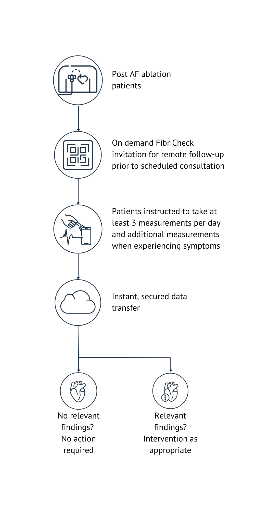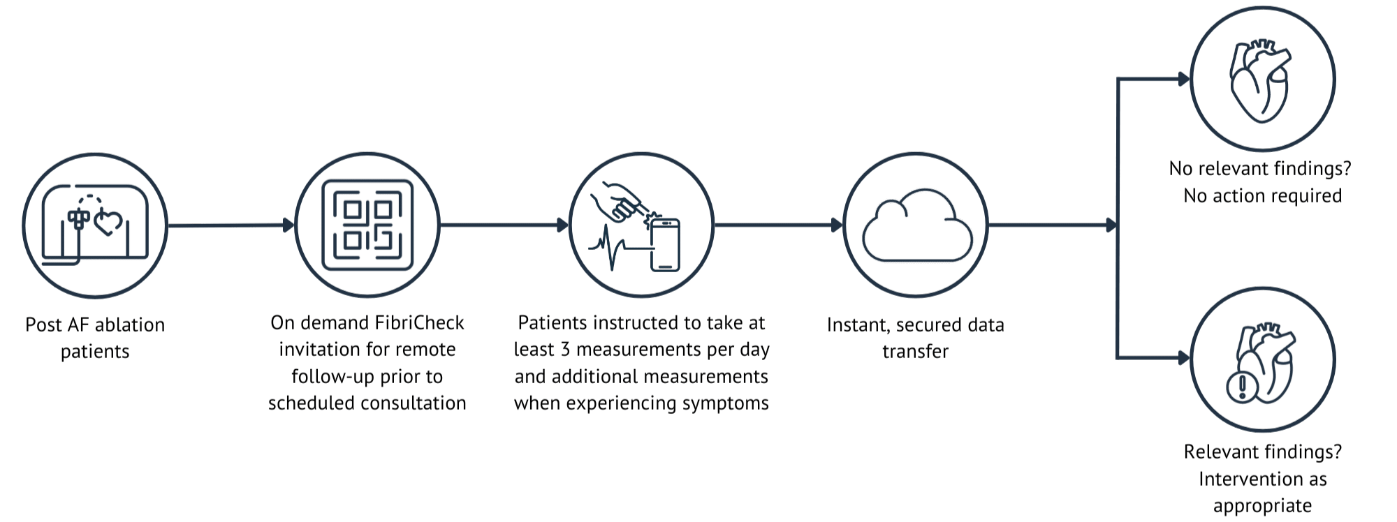 After a PVI ablation, a patient will traditionally be monitored with a (24h Holter) ECG before a follow-up consultation. FibriCheck is providing a digital alternative to this usual care pathway. In this digital-first pathway, the patient does not receive a ECG monitor, but is provided (remotely) with a FibriCheck prescription that allows him/her access to the certified FibriCheck app. This prescription also links the patient to the care team to ensure proper follow-up in the HCP portal.